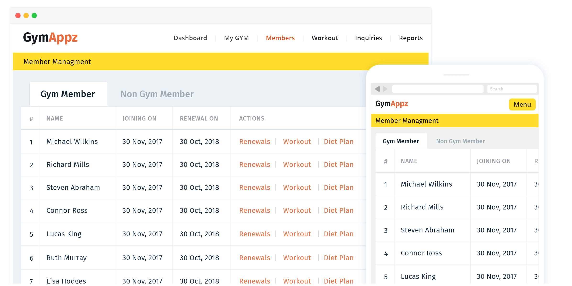 Offer all important details on your member's fingertips. Membership details, their workouts, diet plan, sessions, renewal and more!